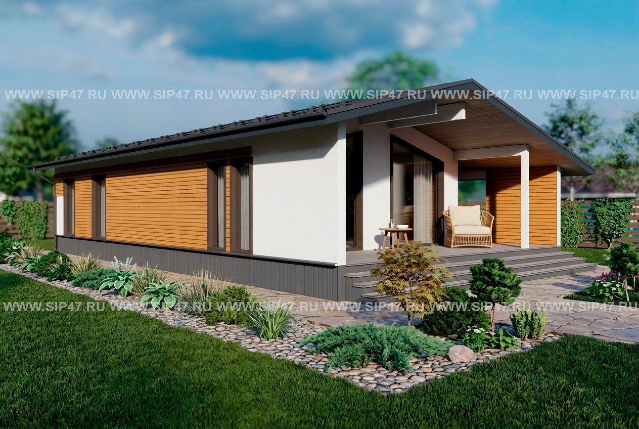 Дом из сип-панелей 164 м², площадь застройки 17,5х9,3 метров. Толщина наружных стеновых СИП — панелей 174 мм, толщина СИП — панелей перекрытий 174 мм, толщина СИП — панелей кровли 174 мм Фундамент — деревянный ростверк на винтовых сваях.
