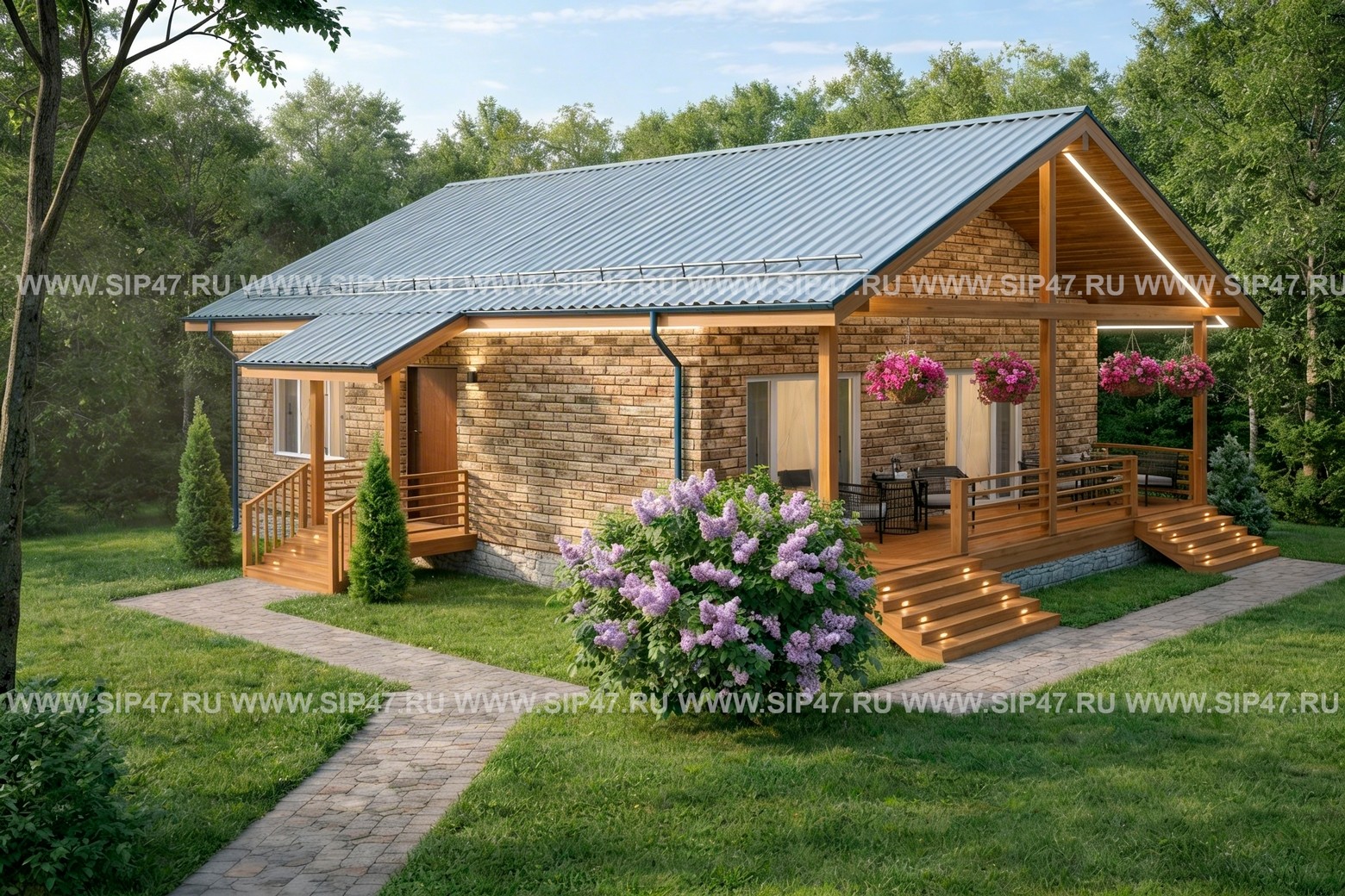 Одноэтажный СИП - дом 9х12 м. для круглогодичного проживания, дом площадью всего 112 м2. Толщина наружных стеновых СИП — панелей 174 мм, толщина СИП — панелей пола 174 мм.