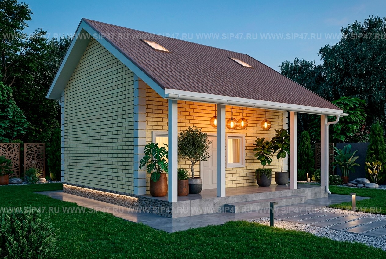 Дом из сип панелей 113 м² с мансардными окнами. Толщина наружных стен СИП – панелей 174 мм, толщина СИП – панелей цокольного, межэтажного перекрытий 174 мм, Толщина внутренних перегородок – каркас 150 мм. Фундамент — деревянный ростверк на винтовых сваях.