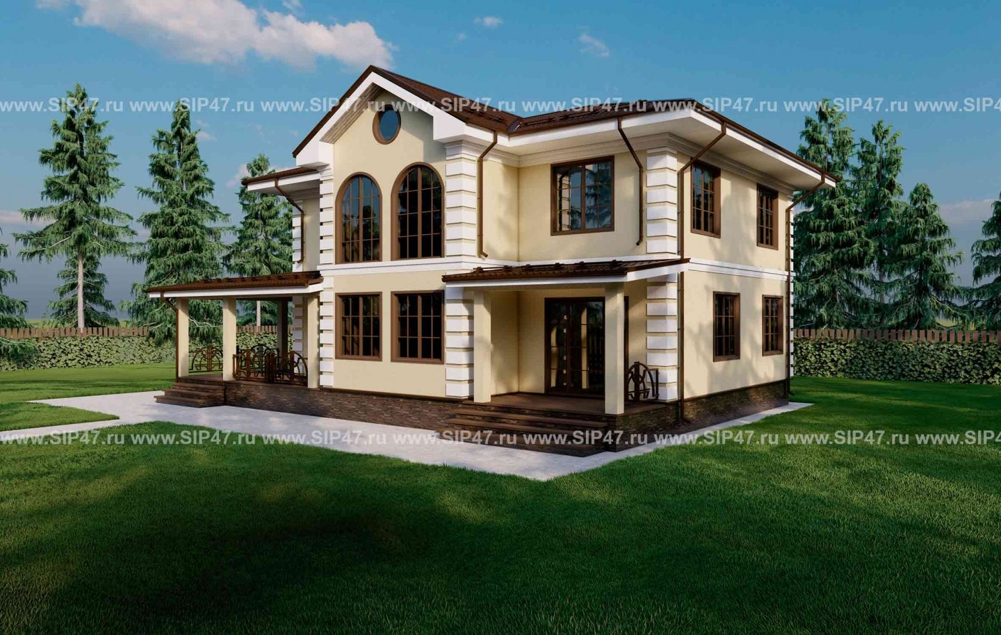 Дом из сип панелей 198 м². Толщина наружных стеновых СИП — панелей 174 мм, толщина СИП — панелей перекрытий 174 мм. Фундамент — плита.