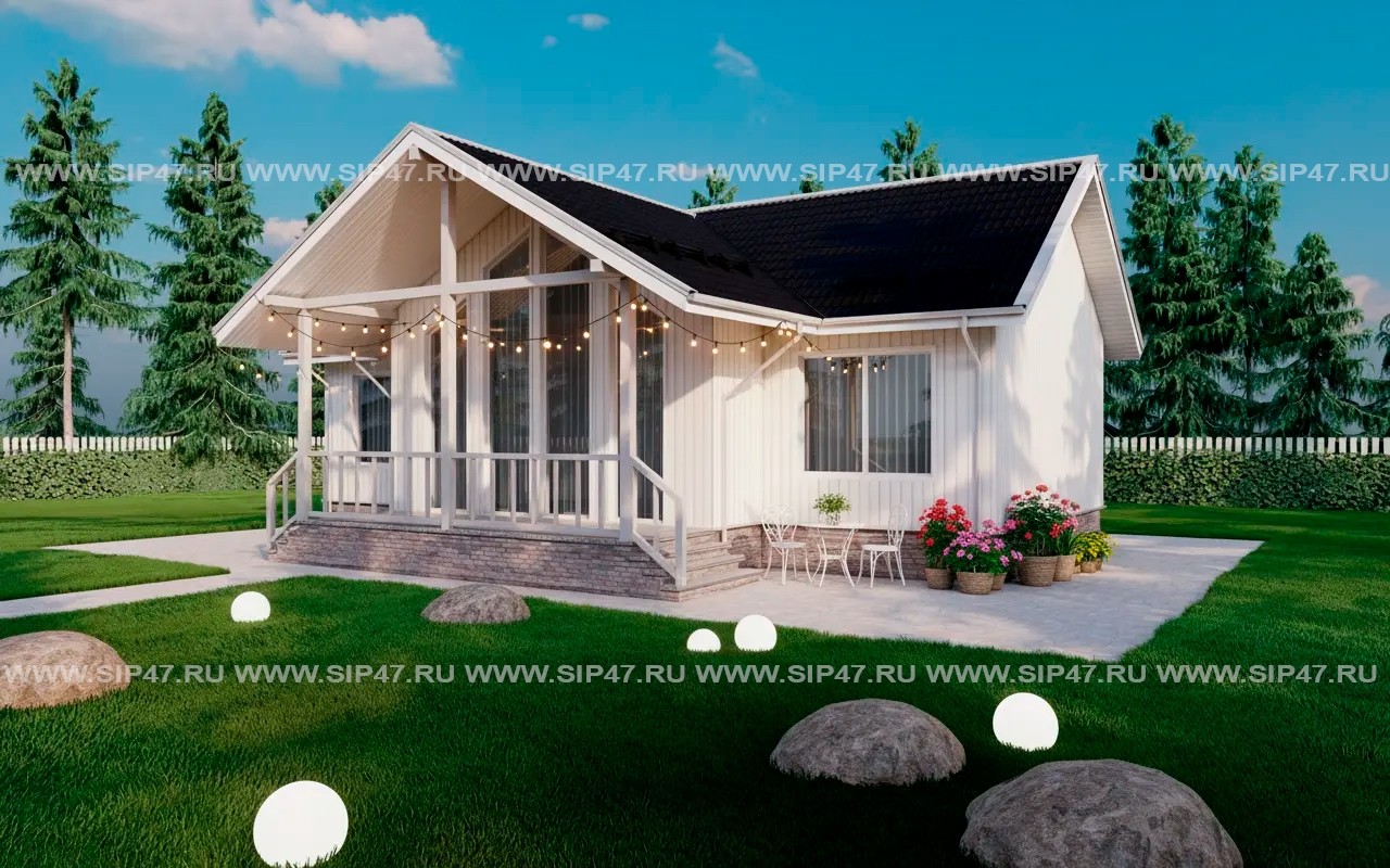 Дом из СИП панелей 147 м². Толщина наружных стеновых СИП — панелей 174 мм, толщина СИП — панелей перекрытий 174 мм. Фундамент — деревянный ростверк на винтовых сваях.