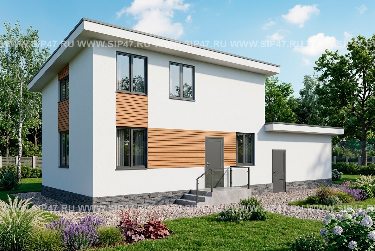 Двухэтажный дом из СИП-панелей для круглогодичного проживания с гаражом.