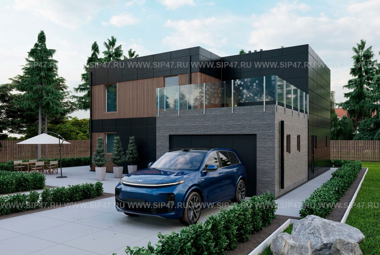 Дом из сип панелей 339 м² с гаражом. Толщина наружных стен СИП - панелей 174 мм, толщина СИП - панелей кровли этажа 224 мм, межэтажное перекрытие двутавровые балки, каркас внутренних перегородок 150 мм . Фундамент — монолитная плита.
