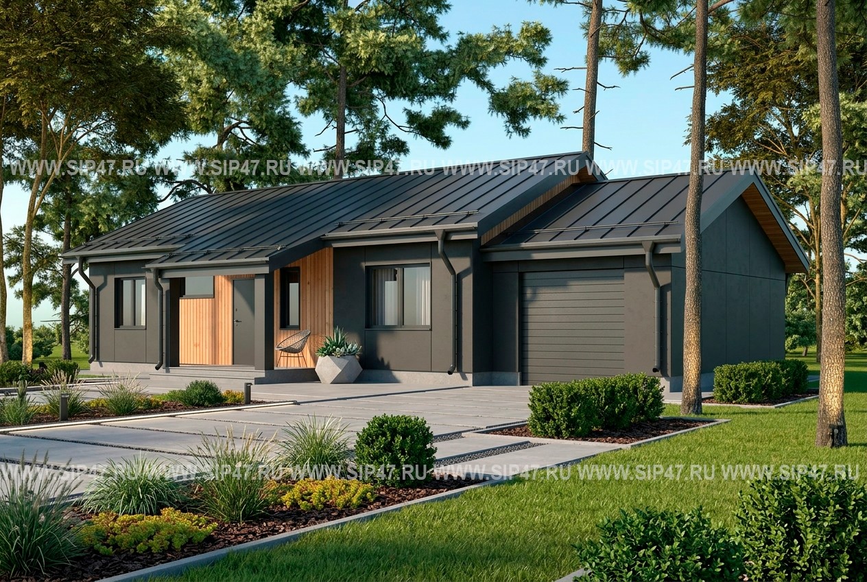 Одноэтажный дом с гаражом из СИП- панелей для круглогодичного проживания. Площадь застройки 154 м². Полезная площадь 121,6 м².