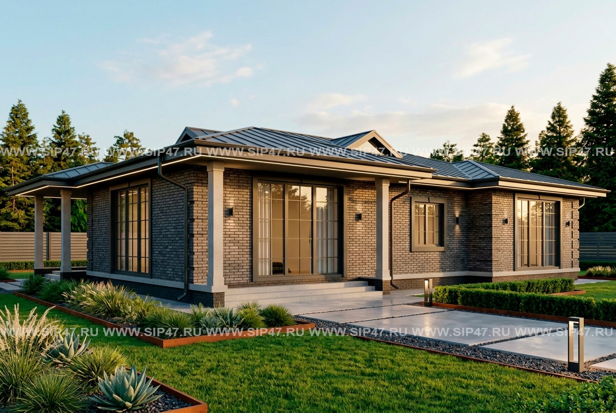 Одноэтажный дом из СИП-панелей для круглогодичного проживания. Площадь застройки 217 кв.м.