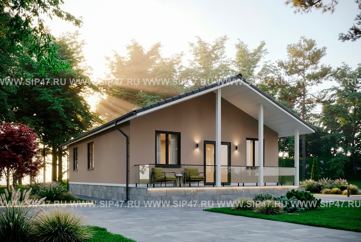 Проект одноэтажного дома из СИП-панелей для круглогодичного проживания с простой и практичной планировкой.