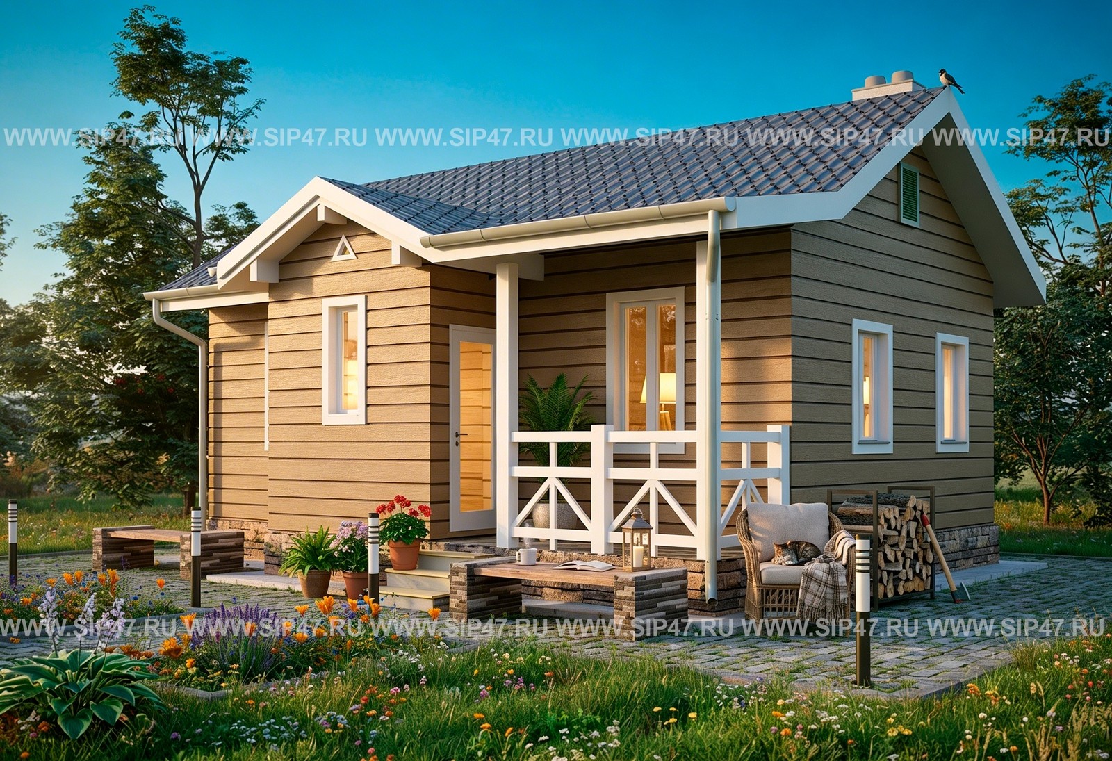 Небольшой одноэтажный дачный дом из СИП-панелей в котором есть кухня, гостиная, спальня и санузел. Толщина наружных стеновых СИП-панелей 174 мм, толщина СИП-панелей перекрытий 174 мм, толщина СИП- перегородок 124 мм. Фундамент — деревянный ростверк на винтовых сваях.