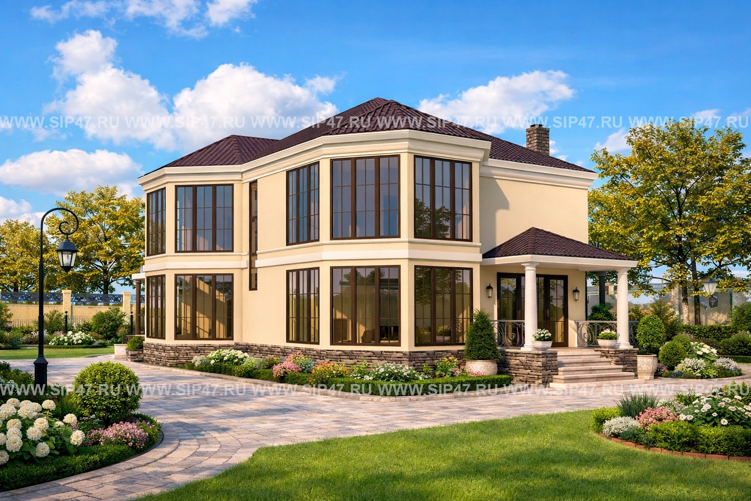 Большой, современный дом из СИП-панелей в классическом стиле с двумя эркерами и банным комплексом.