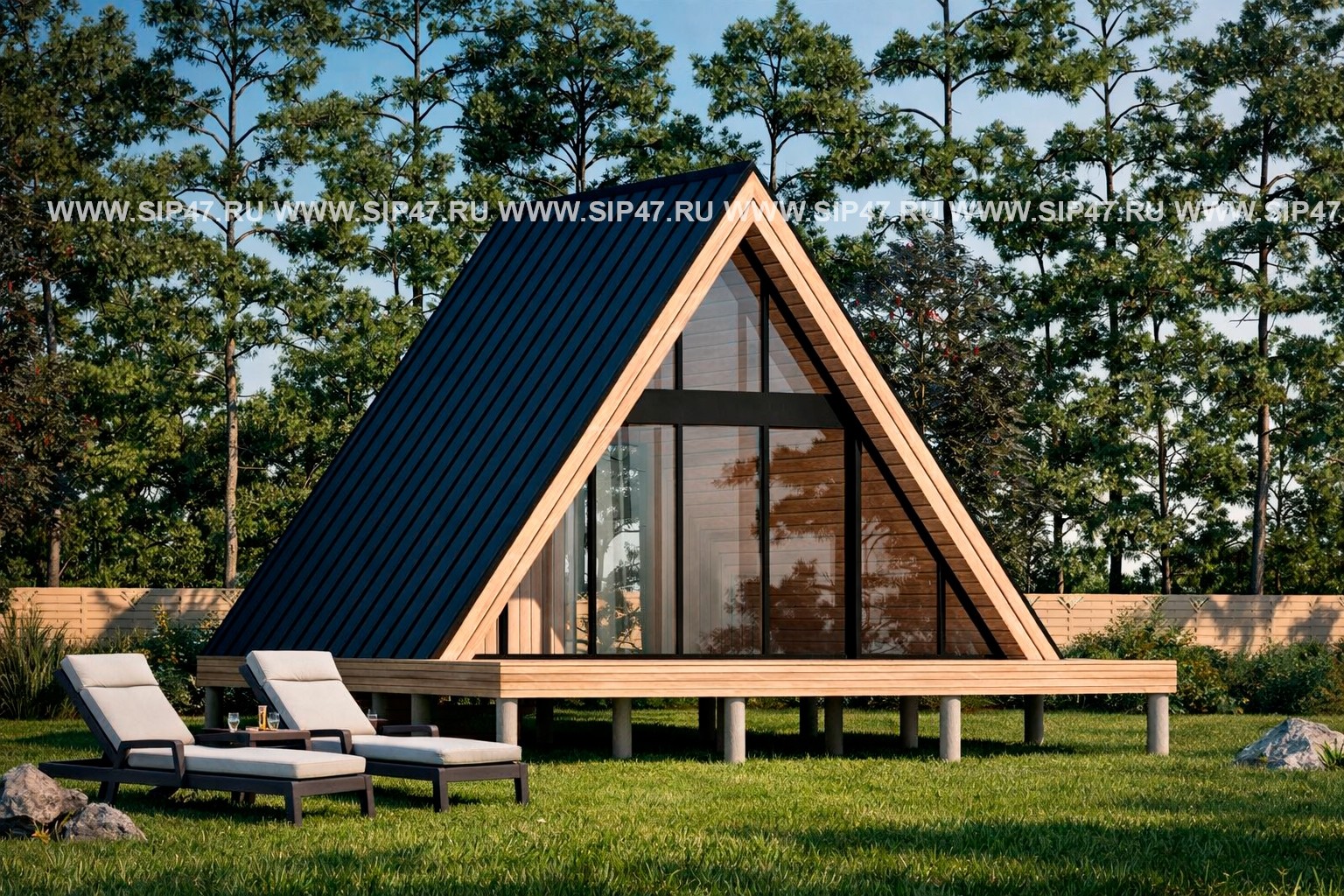 Небольшой дом из СИП-панелей "Альфа" в котором есть кухня-гостиная, спальное место на 1 этаже и спальное место на антресоли и санузел. Толщина наружных стеновых СИП-панелей 174 мм, толщина СИП-панелей перекрытий 174 мм. Фундамент — деревянный ростверк на винтовых сваях.