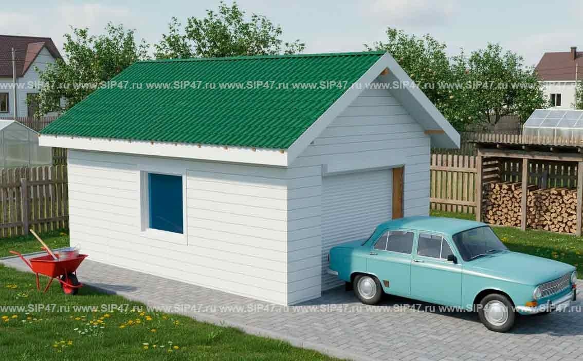 Гараж из сип-панелей 24 м², площадь застройки 6х4 метров. Толщина наружных стеновых СИП — панелей 174 мм, толщина СИП — панелей перекрытий 174 мм, толщина СИП — панелей кровли 174 мм Фундамент — деревянный ростверк на винтовых сваях.