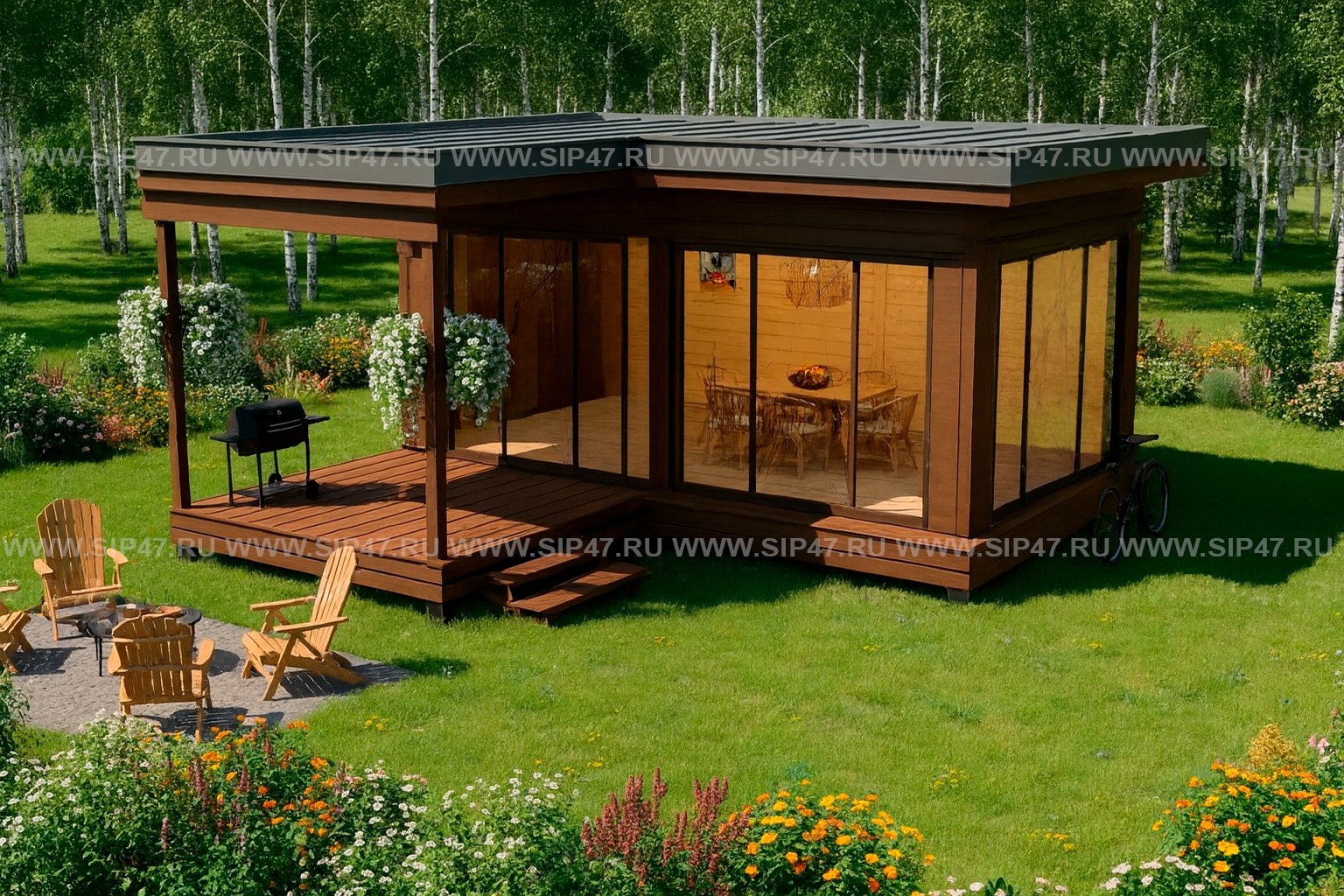 Гриль-домик/беседка из СИП панелей 5,9х5,2 площадью 27 м². Толщина наружных стеновых СИП — панелей 124 мм, толщина СИП — панелей пола 124 мм. Фундамент — деревянный ростверк на винтовых сваях.