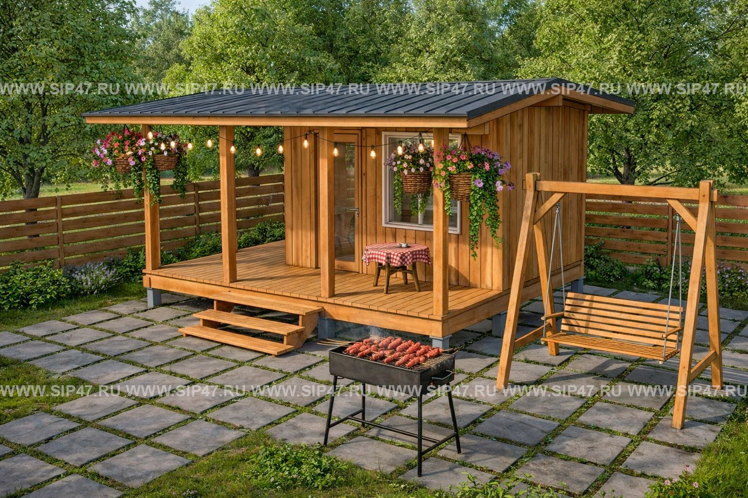 Летняя кухня/гриль-домик из СИП панелей 4х3,3 с террасой 6х5 с общей площадью 30 м². Толщина наружных стеновых СИП — панелей 124 мм, толщина СИП — панелей пола 174 мм.
