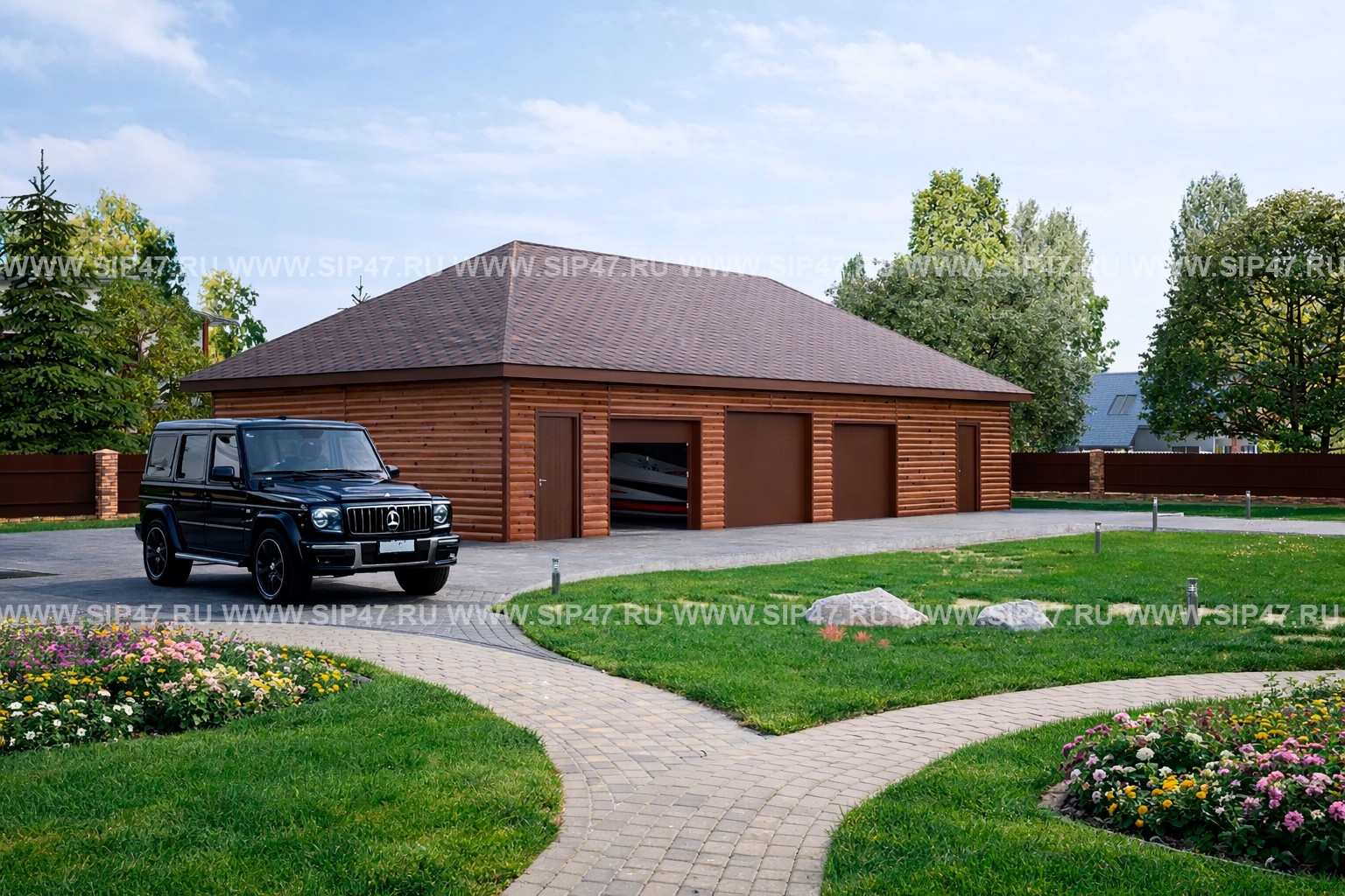 Большой, теплый гараж из СИП-панелей для двух автомобилей и катера.
