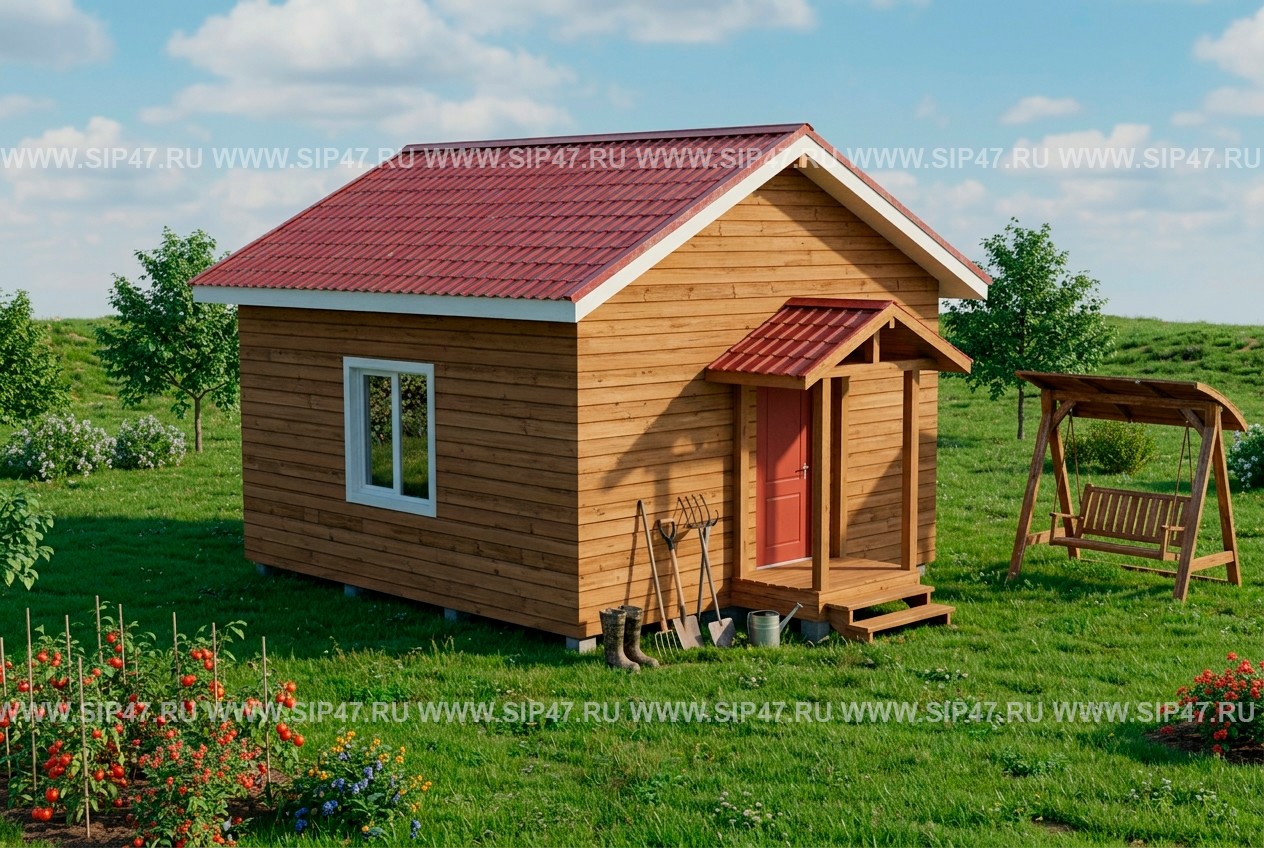 Одноэтажный садовый дом 6х6 для круглогодичного проживания, дом площадью всего 36 м2, планировка свободная. Другие названия данного типового проекта: Дачный дом из сип панелей, летний домик, садовый дом из сип панелей. Толщина наружных стеновых СИП — панелей 174 мм, толщина СИП — панелей пола 224 мм. Фундамент — деревянный ростверк на винтовых сваях.