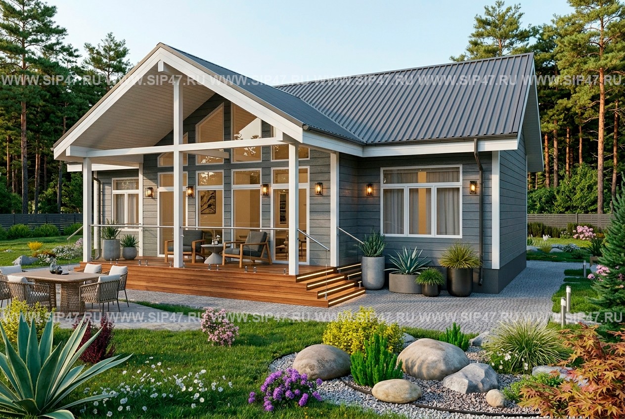Дом из СИП панелей 101 м². Толщина наружных стеновых СИП — панелей 174 мм, толщина СИП — панелей перекрытий 174 мм. Толщина внутренних перегородок – каркас 150 мм. Фундамент — деревянный ростверк на винтовых сваях.
