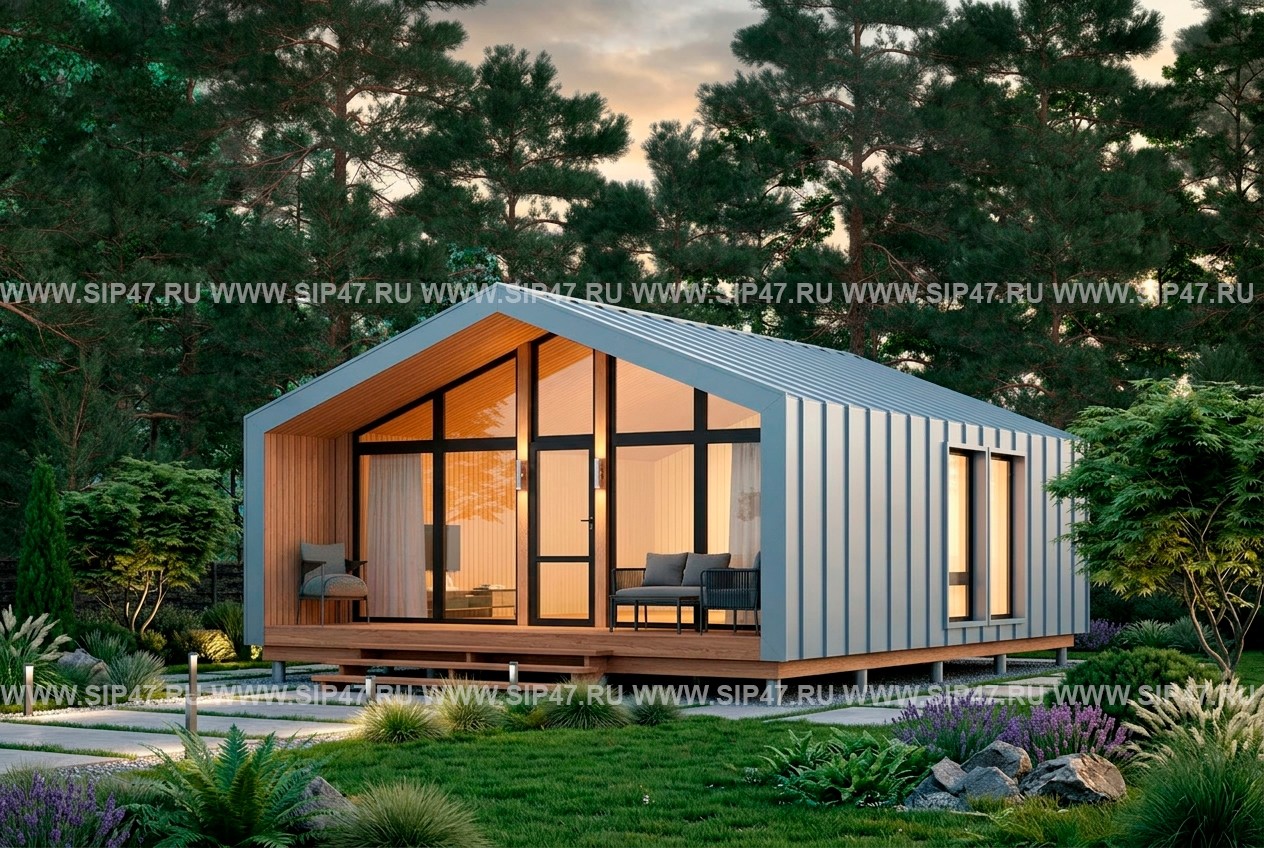 Небольшой одноэтажный дачный дом из СИП-панелей в котором есть кухня, гостиная, спальня и санузел. Толщина наружных стеновых СИП-панелей 174 мм, толщина СИП-панелей перекрытий 174 мм. Фундамент — деревянный ростверк на винтовых сваях.