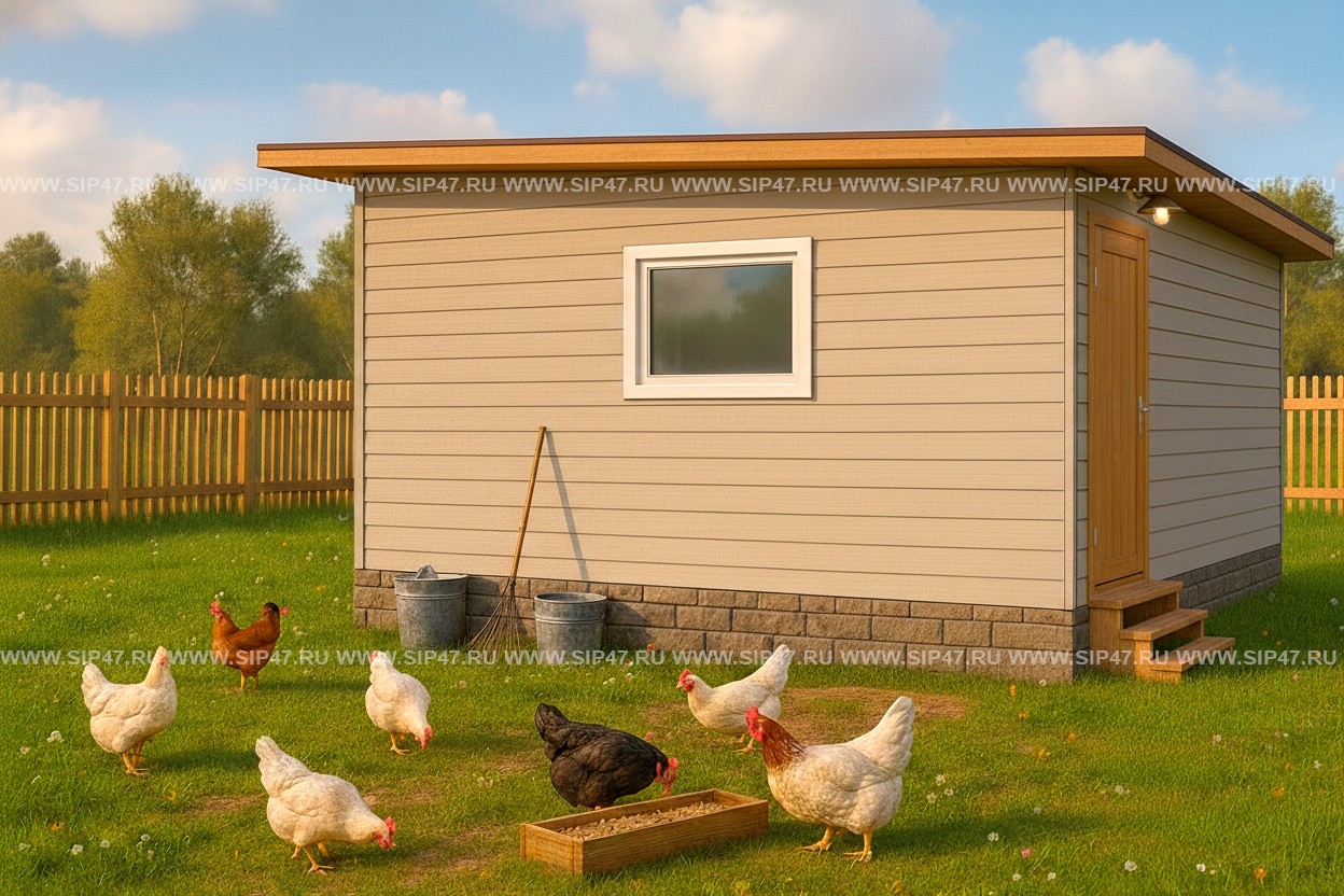 Птичник из СИП панелей 3,7х2,5 площадью 9 м². Толщина наружных стеновых СИП — панелей 68 мм, толщина СИП — панелей пола 174 мм, толщина СИП-панелей кровли 168 мм. Фундамент — деревянный ростверк на винтовых сваях.