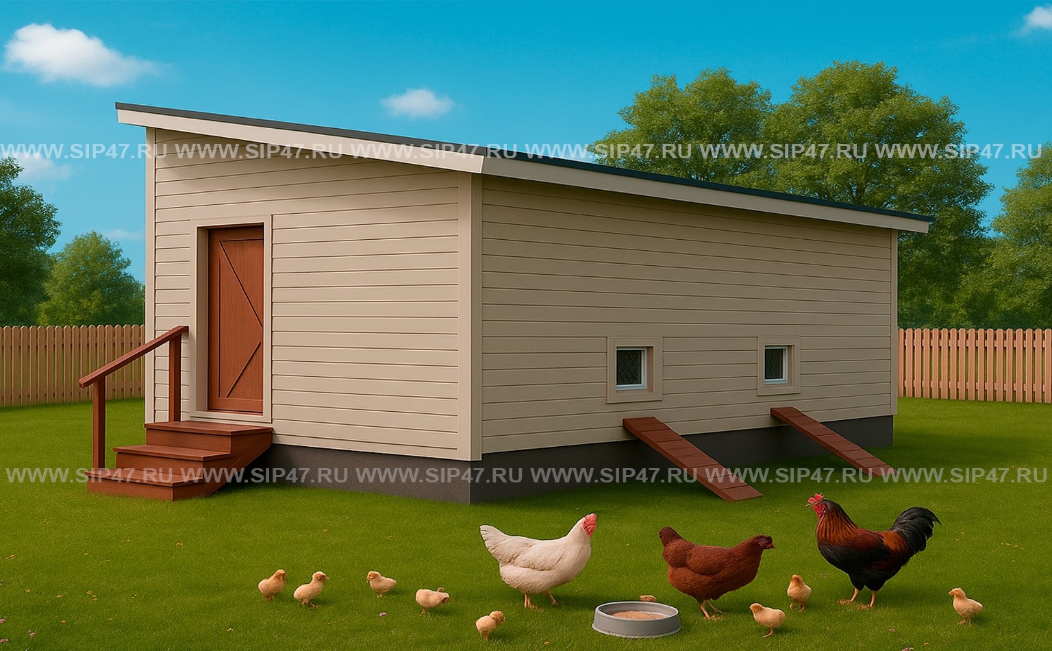 Птичник из СИП панелей 10х4, площадью 40 м². Толщина наружных стеновых СИП — панелей 124 мм, толщина СИП — панелей пола 174 мм. Фундамент — деревянный ростверк на винтовых сваях.